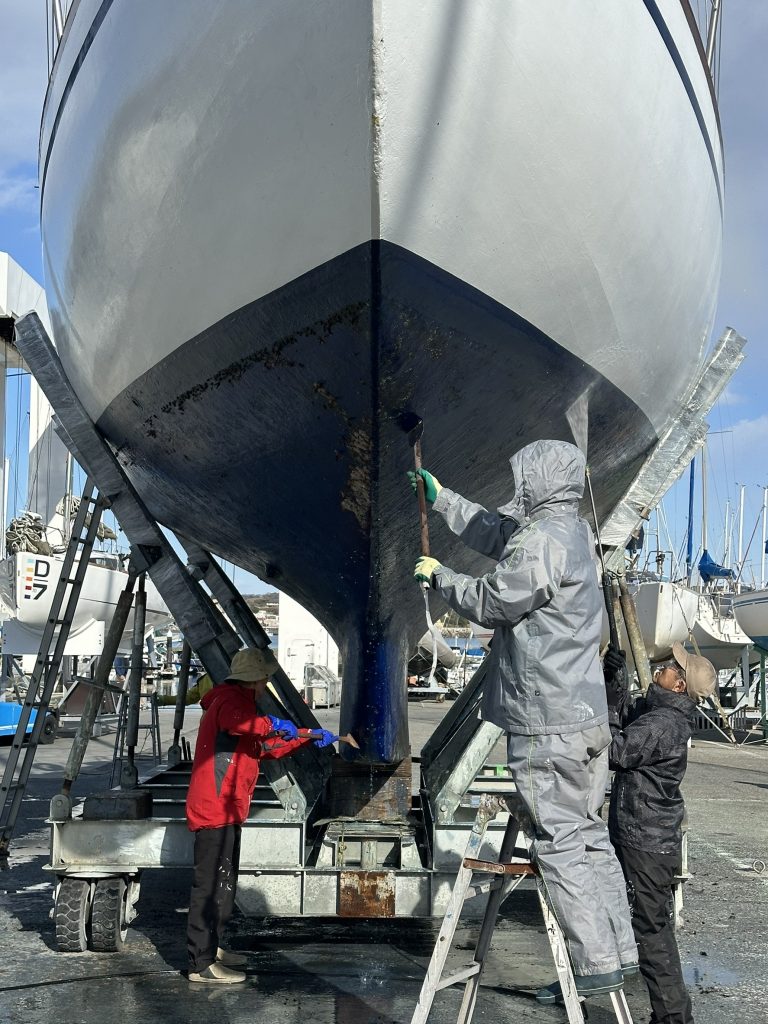 現在、船台に載せられ、クルー有志による船底や船体の再塗装作業が進められています。
